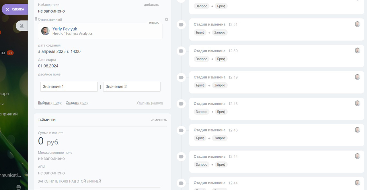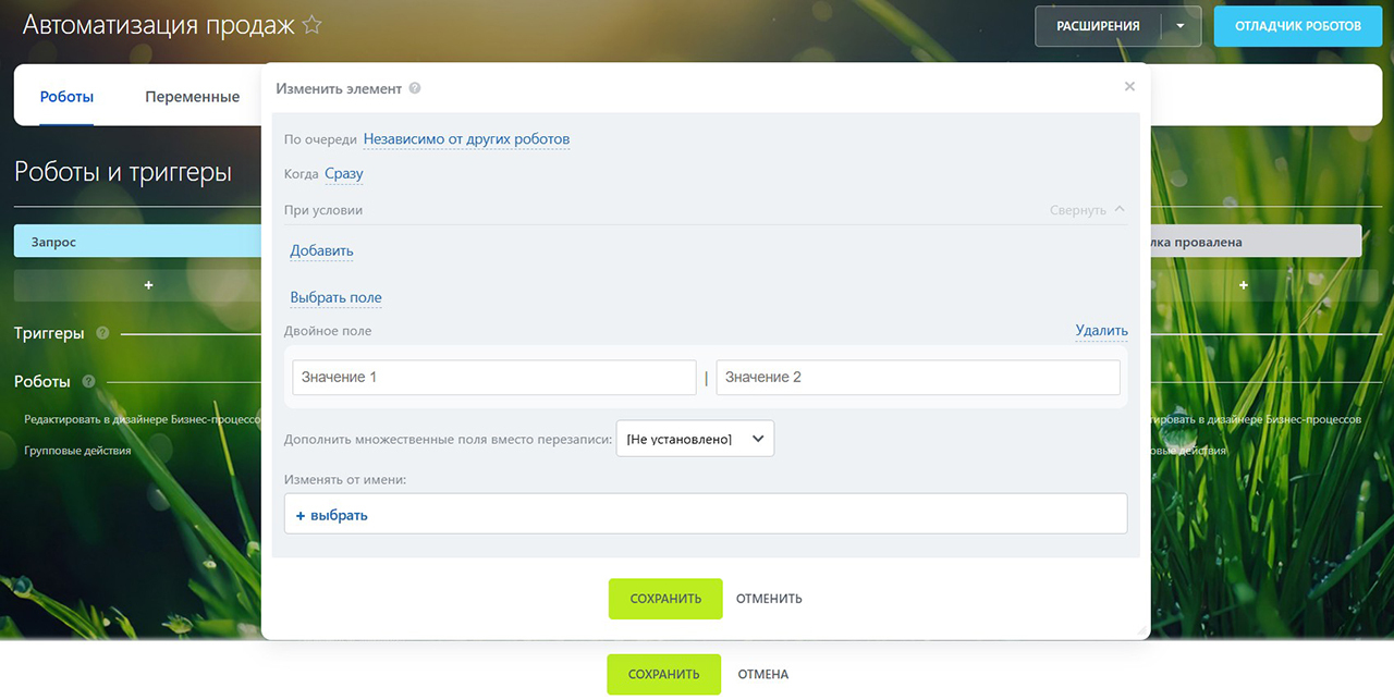 Роботы работают прекрасно. В роботе «Изменить элемент» двойное поле появляется в списке, и вы можете подставить туда любые данные. Подстановки тоже работают. Например, слева название сделки, справа ответственный. Перевожу сделку в нужную стадию — робот срабатывает — поле заполняется. Я сделал именно такой тест, и всё корректно отработало.
