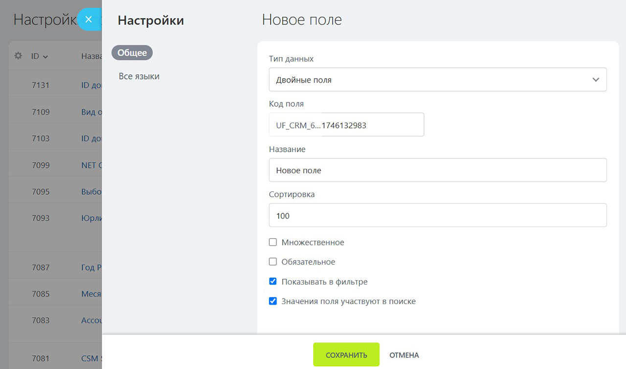 Что такое двойное поле? Бывает, что информация в поле короткая, но к ней нужен комментарий. Например, клиент дает телефон и говорит: звоните до 18:00 или не звоните с двух до трех — ребенка укладываю спать. Комментарий к значению поля сделать нельзя, приходится создавать отдельное поле. И если таких случаев несколько, карточка растягивается вниз длинной колонкой. Логичнее было бы поставить два связанных поля рядом — слева значение, справа комментарий. Или бывает, что у одного показателя два параметра, например ширина и длина. Мы решили такую возможность реализовать.