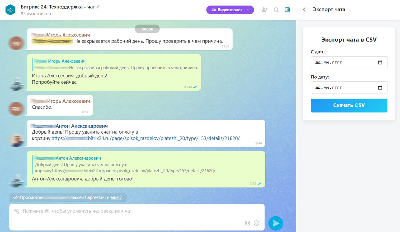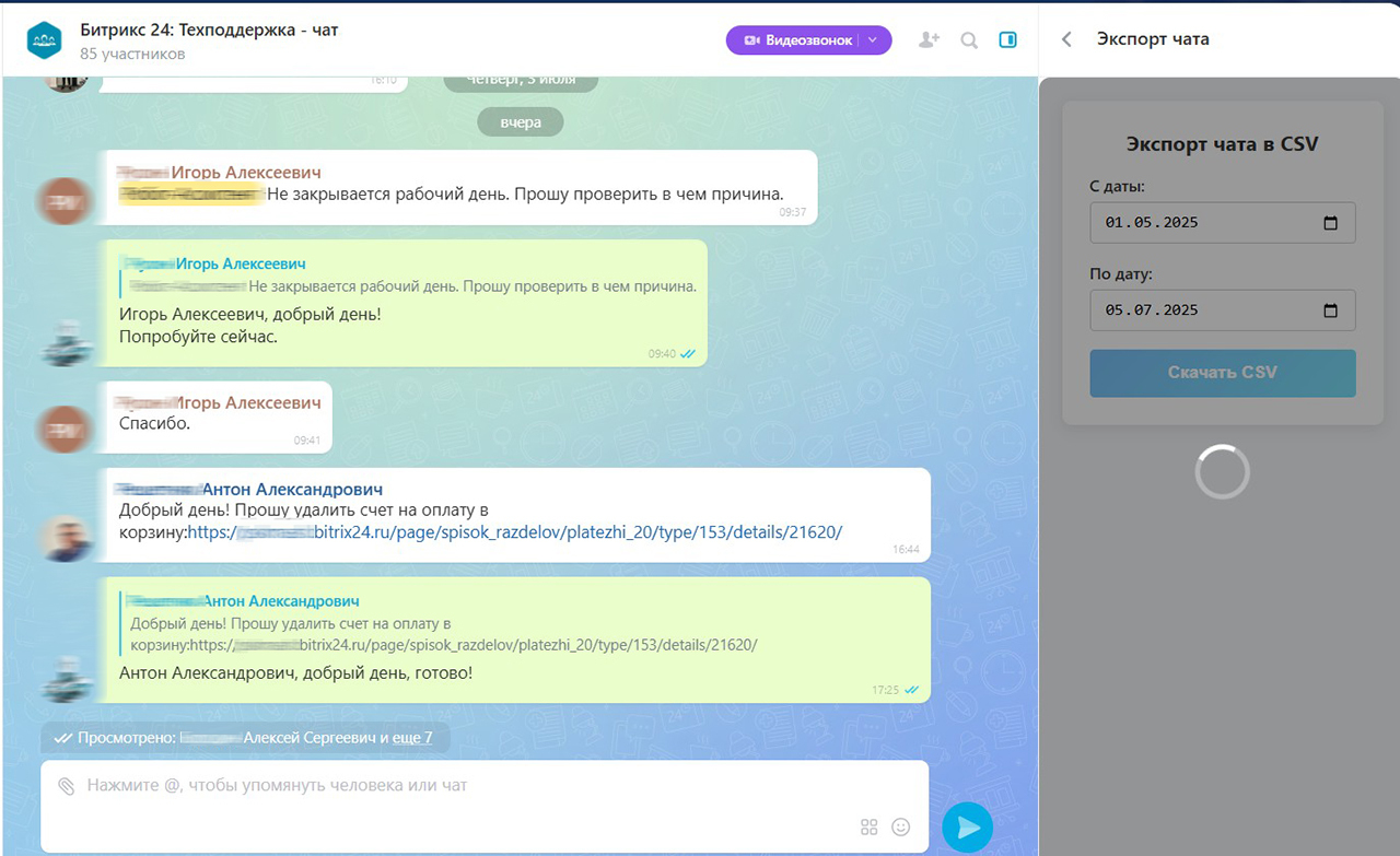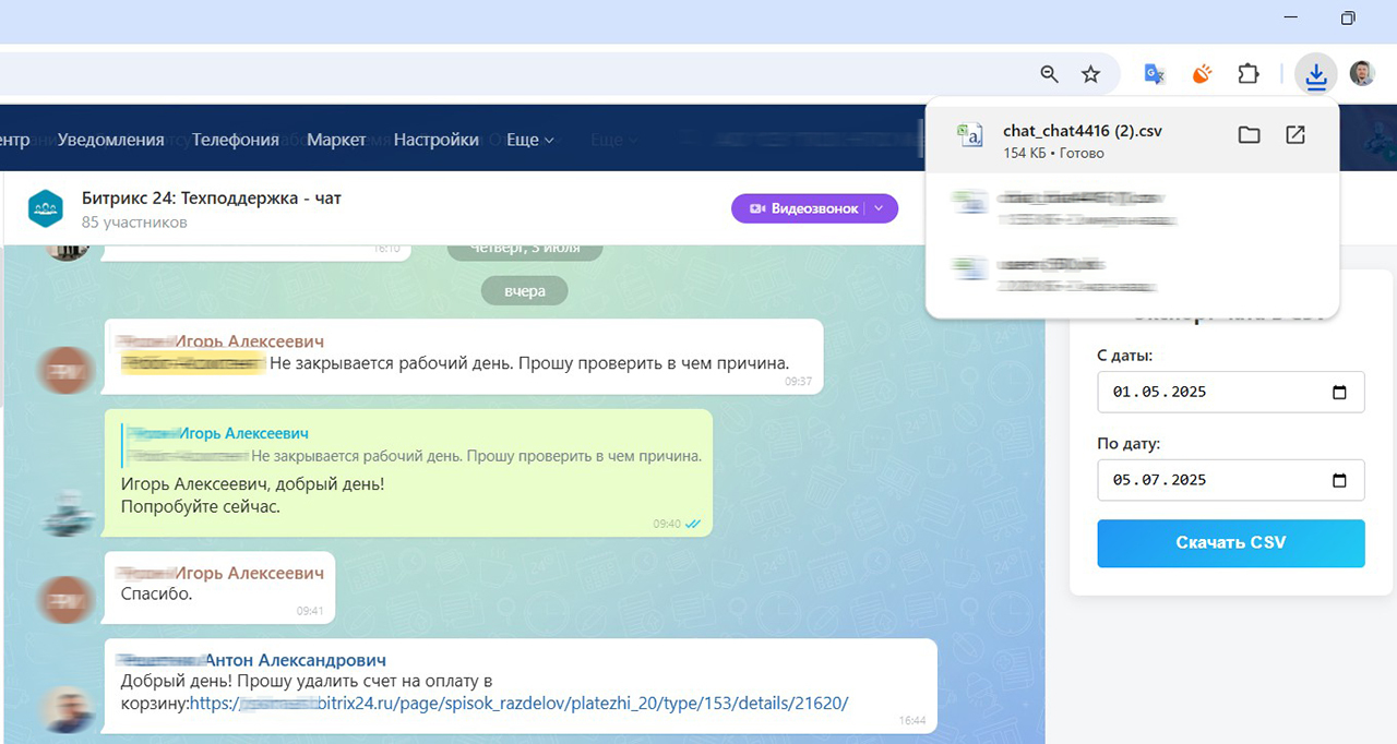 Вот и все. Приложение очень простое. Работает только с внутренними чатами, и если переписка большая, просто дайте экспорту время. На этом все. Мы посмотрели, как работает экспорт чатов в CSV — одно из приложений Digital for Sales. Пусть оно приносит вам пользу, а если что-то понадобится — пишите нам.
