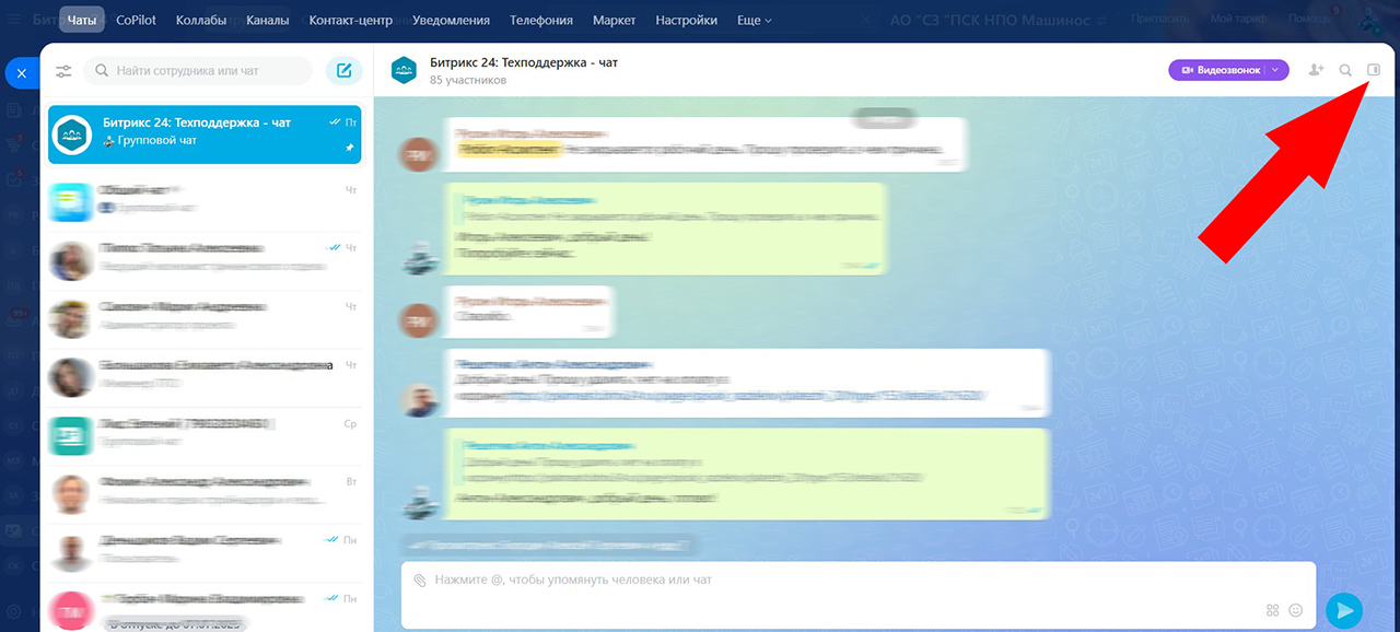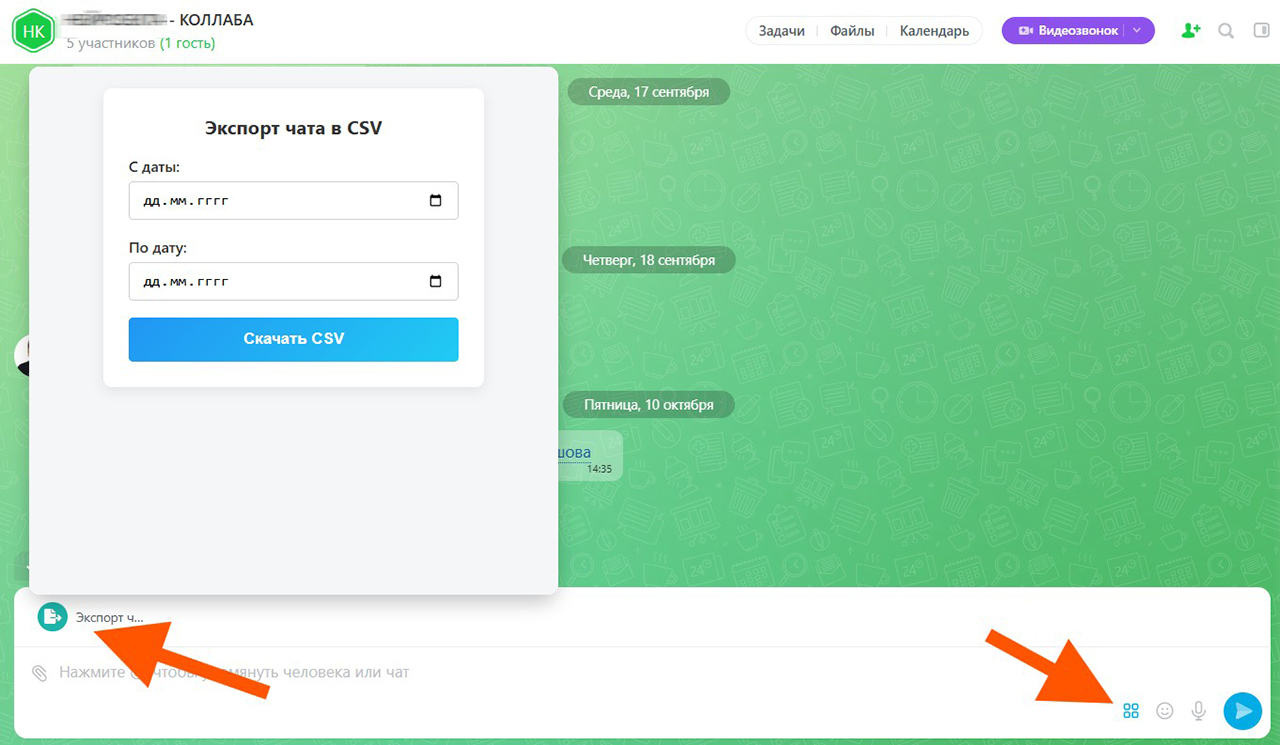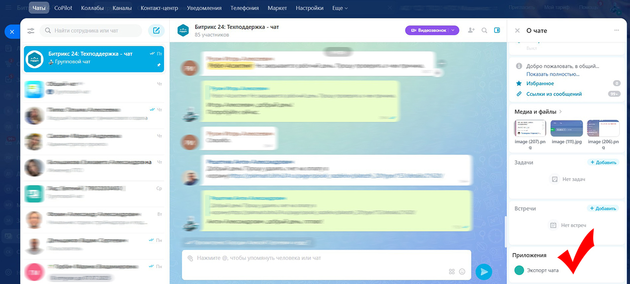 Переходим к работе. Вот раздел с перепиской. Я создал тестовый диалог между двумя учетками. Открываем сайдбар справа, листаем вниз — там появился блок приложений и наше Экспорт чата.