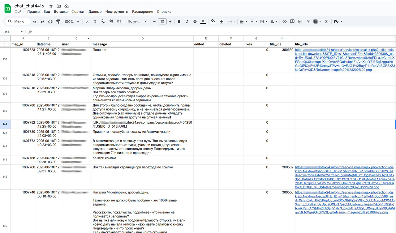 В Битриксе у вас есть групповые чаты — внутри проектов, внутри сделок, да и просто личные переписки. И было бы здорово выгружать такие чаты в таблицу, чтобы дальше анализировать их, обрабатывать, использовать в обучении сотрудников или строить аналитику. Это не абстрактная идея — это реальный кейс. В одной компании сотрудники задавали юридическим отделам вопросы в специальном чате. Годы шли, вопросов становилось все больше, и постепенно сформировалась огромная база знаний. Новые сотрудники приходили, задавали те же вопросы, юристы снова отвечали. Люди редко ищут по истории чата, да и сформулируют вопрос чуть иначе — уже не найдут, что нужно.