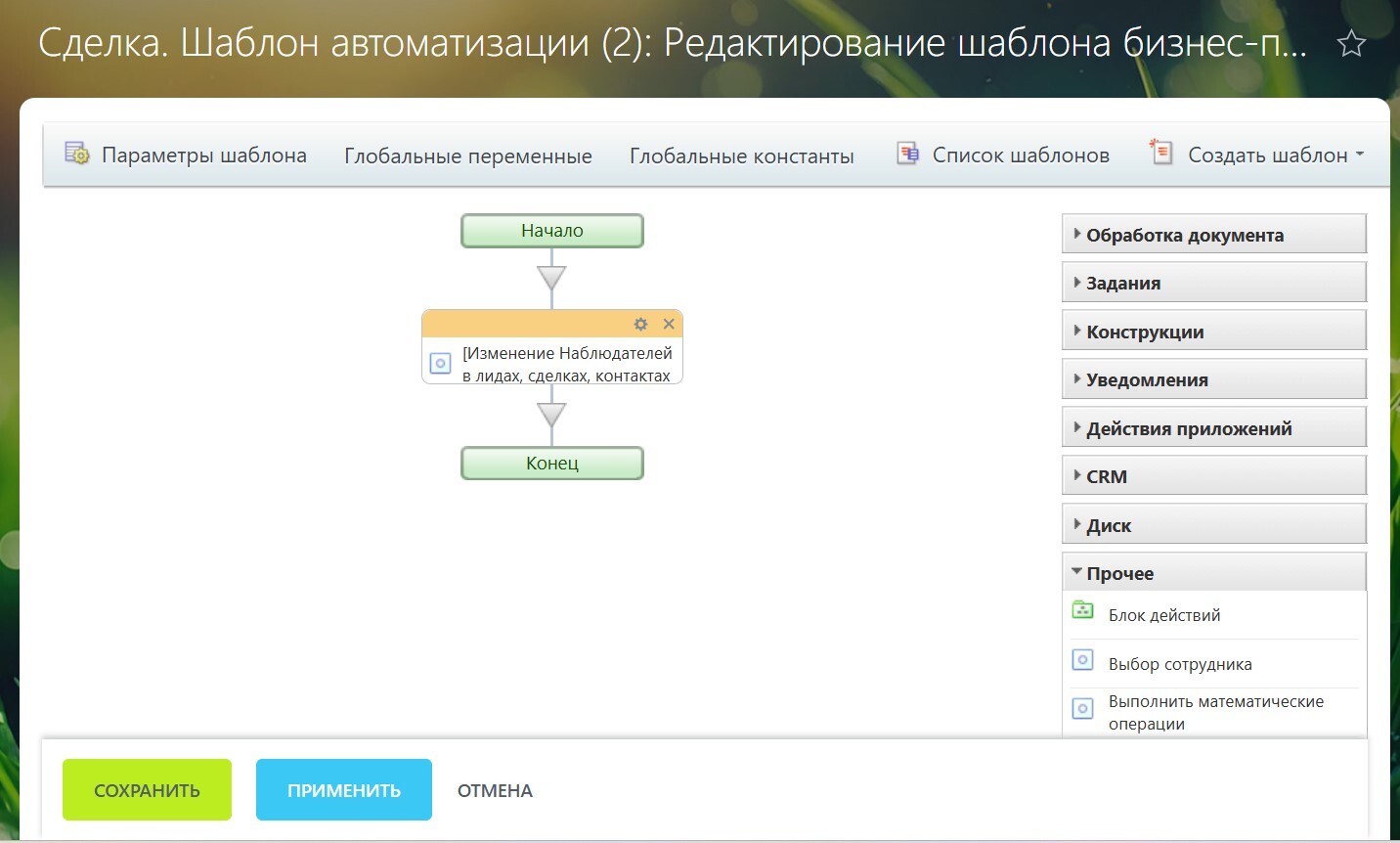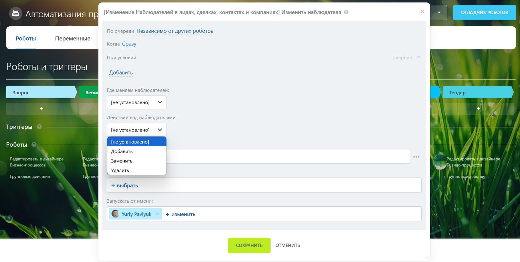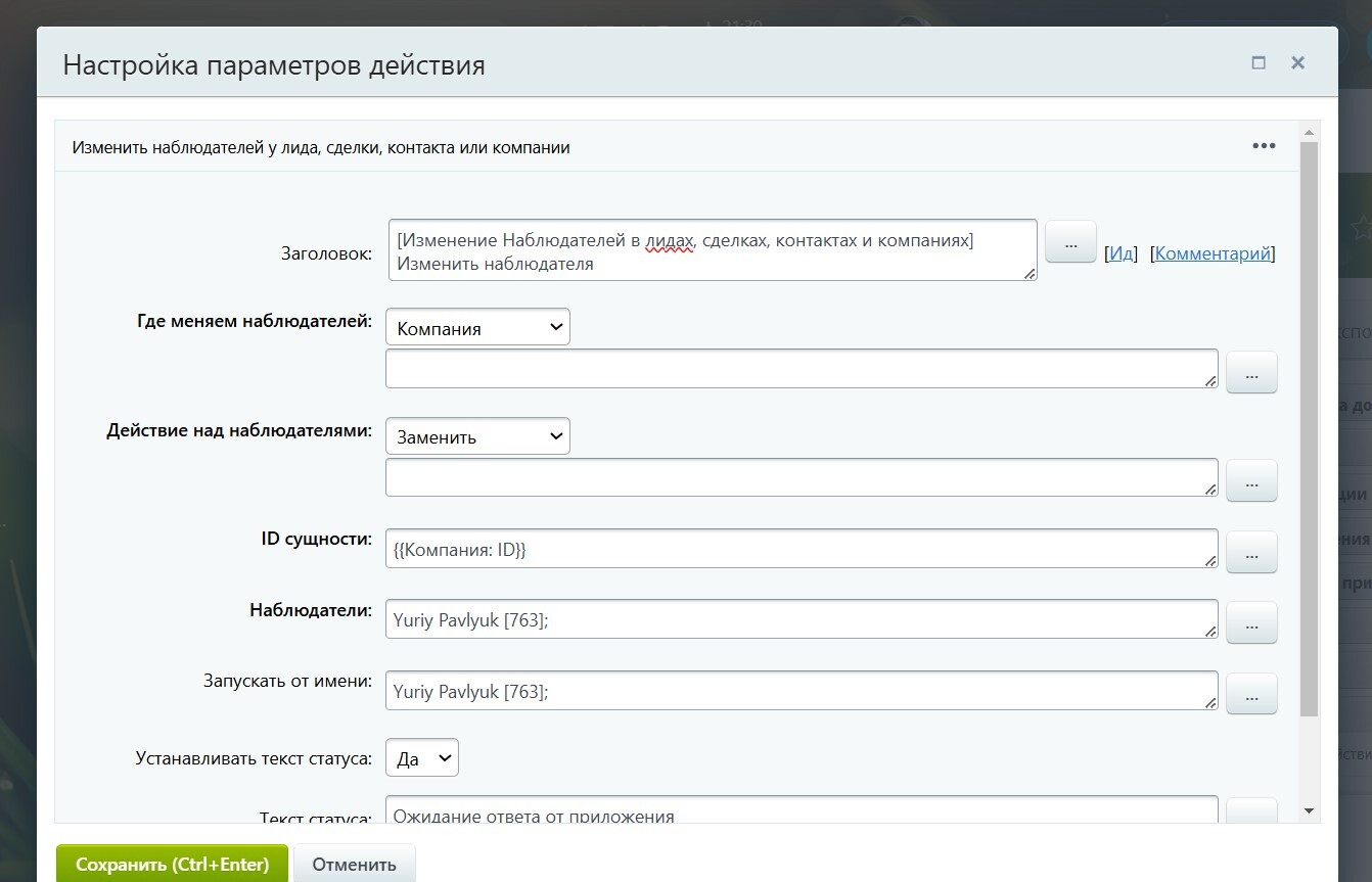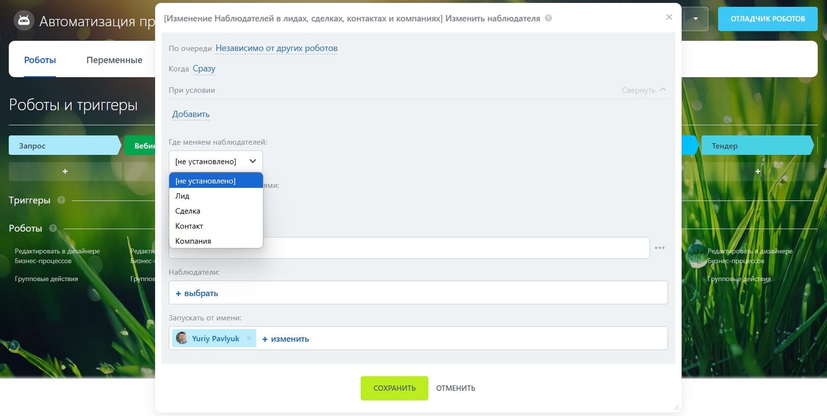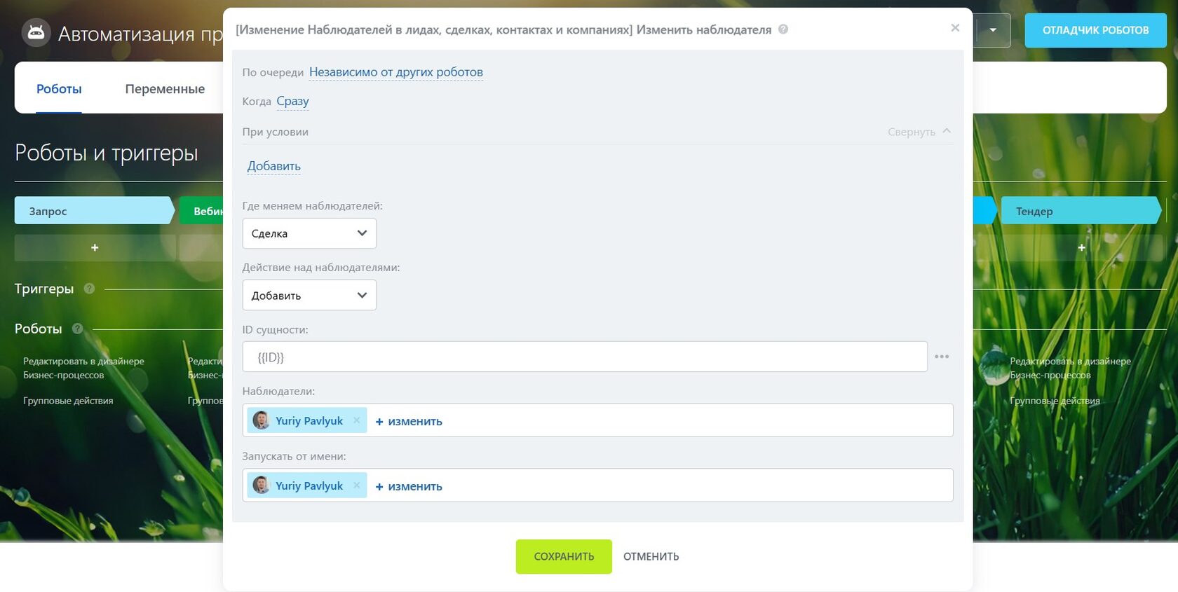 Допустим, я хочу изменить наблюдателя не в сделке, а в контакте, который к этой сделке привязан. Настраиваю робота: выбираю сущность «Контакт», указываю ID контакта (при желании можно подставлять любой ID — хоть вычислять его автоматически по правилам, хоть поднимать-опускаться по иерархии). Сохраняю.