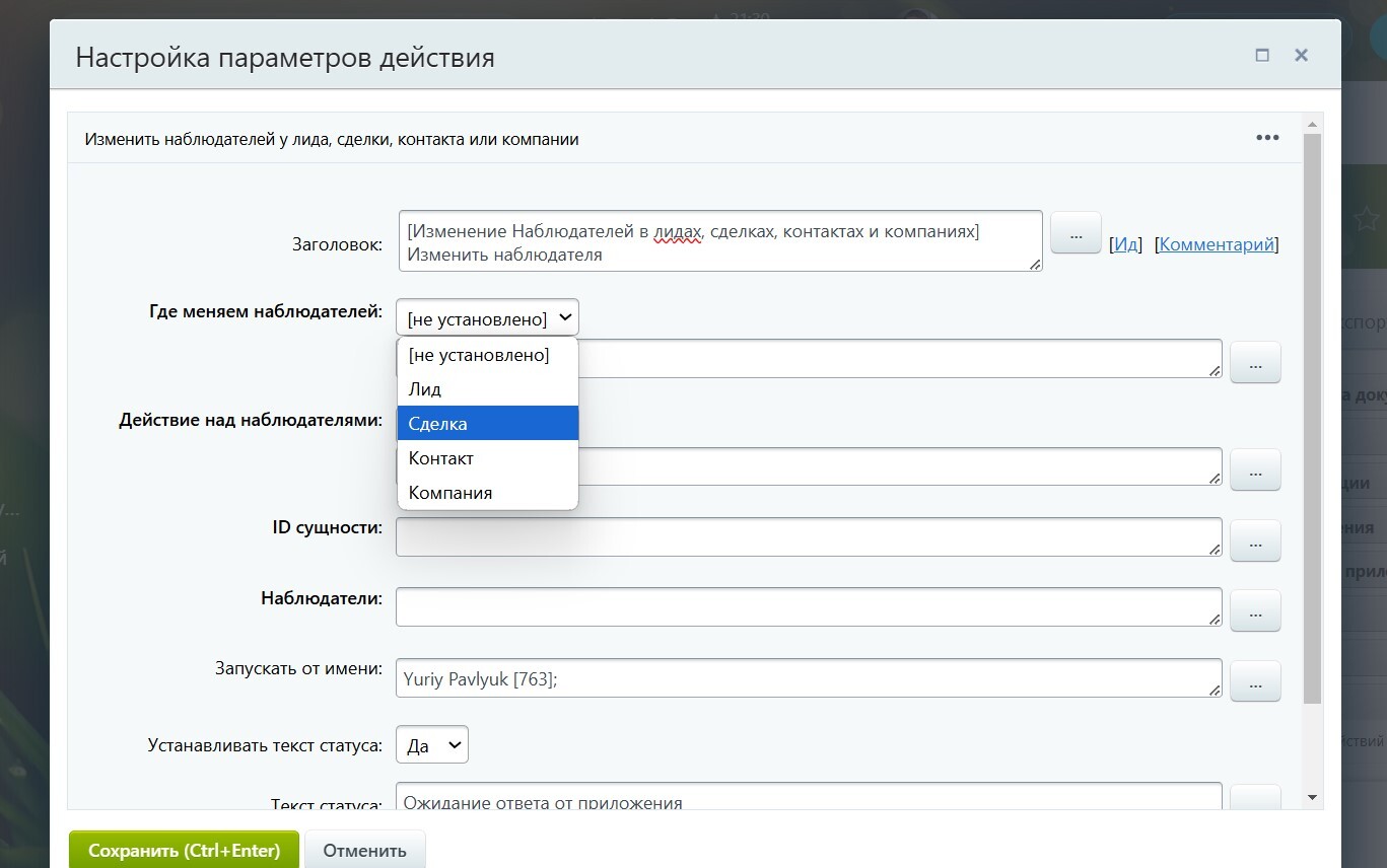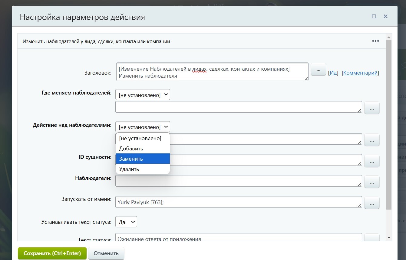 В одном роботе можно изменить наблюдателей сразу в любой из четырёх CRM-сущностей: в лиде, в сделке, в контакте или в компании. То есть вы выбираете сущность — и выполняете нужное действие: добавить, удалить, заменить.
