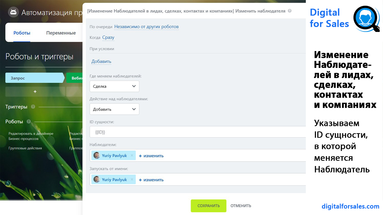 - имеет право изменения соответствующего объекта CRM (контакт, лид, сделка, компания),