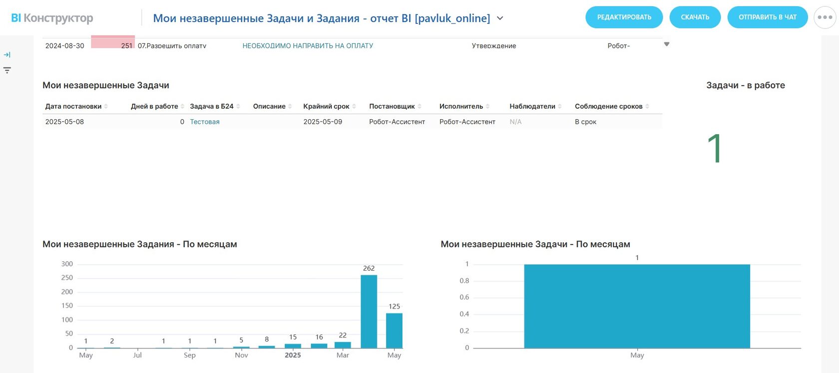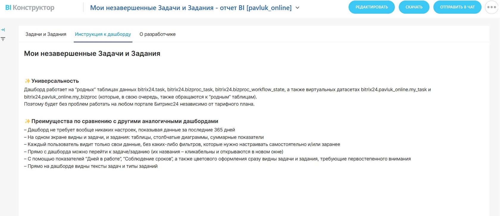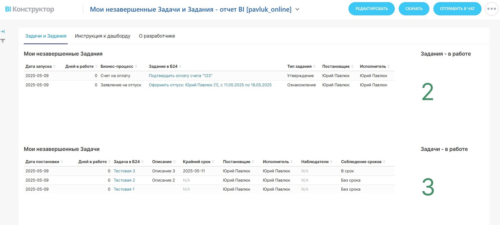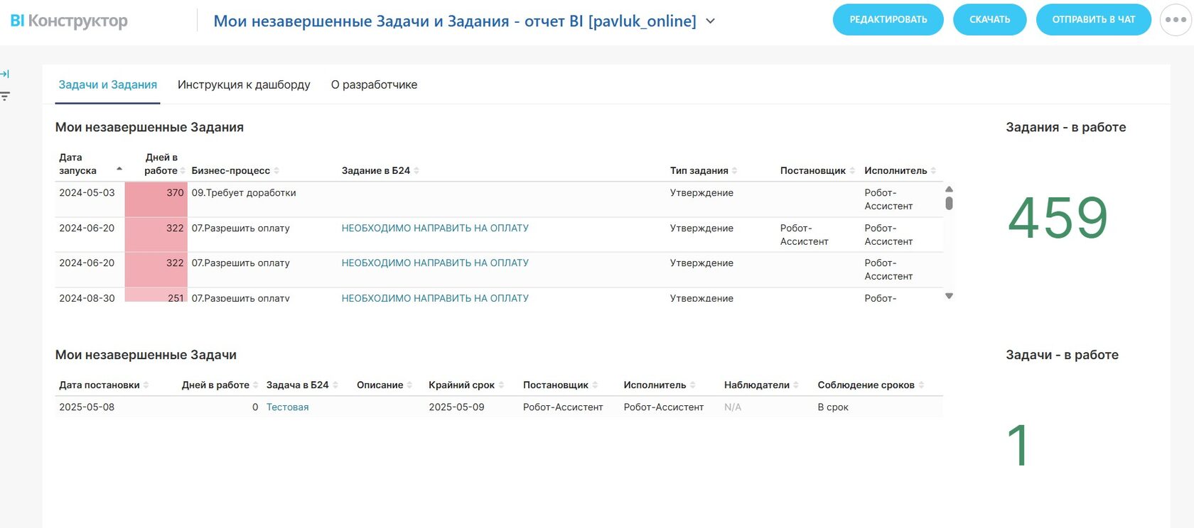 Он показывает тому, кто его открывает, если человек в портале авторизован, только его собственные задачи и задания в статусе «не завершено». То есть всё, что в работе, даже если к выполнению ещё никто и не приступил. Поэтому он и называется «Мои незавершенные задачи и задания». Один человек откроет отчёт — увидит свои элементы, другой — свои. Айдишник пользователя передаётся прямо в ссылке на дашборд, поэтому поделиться ссылкой не получится — она работает только внутри портала. Есть свои минусы, но плюсов однозначно больше.