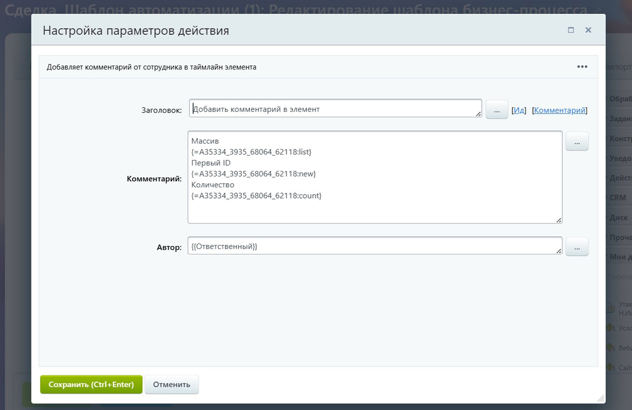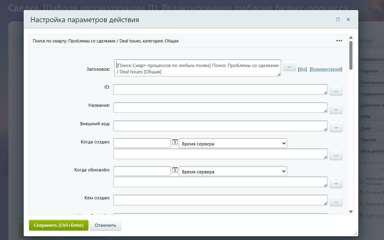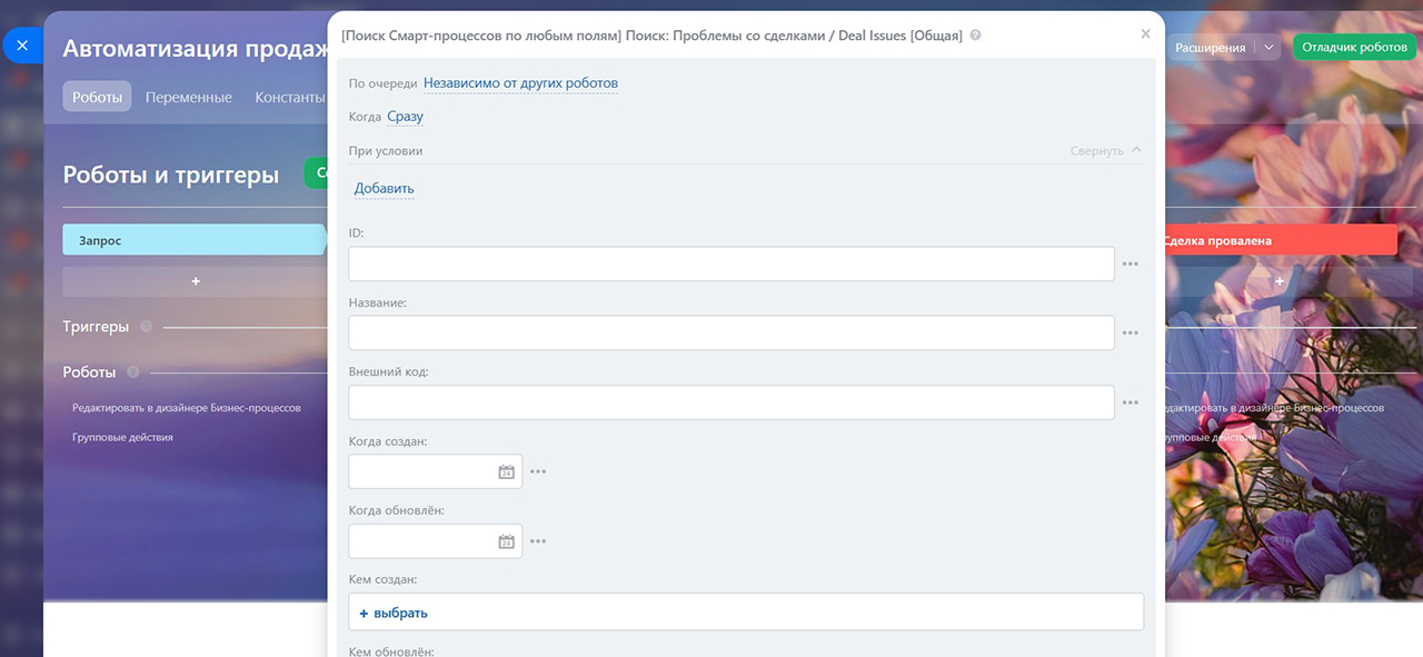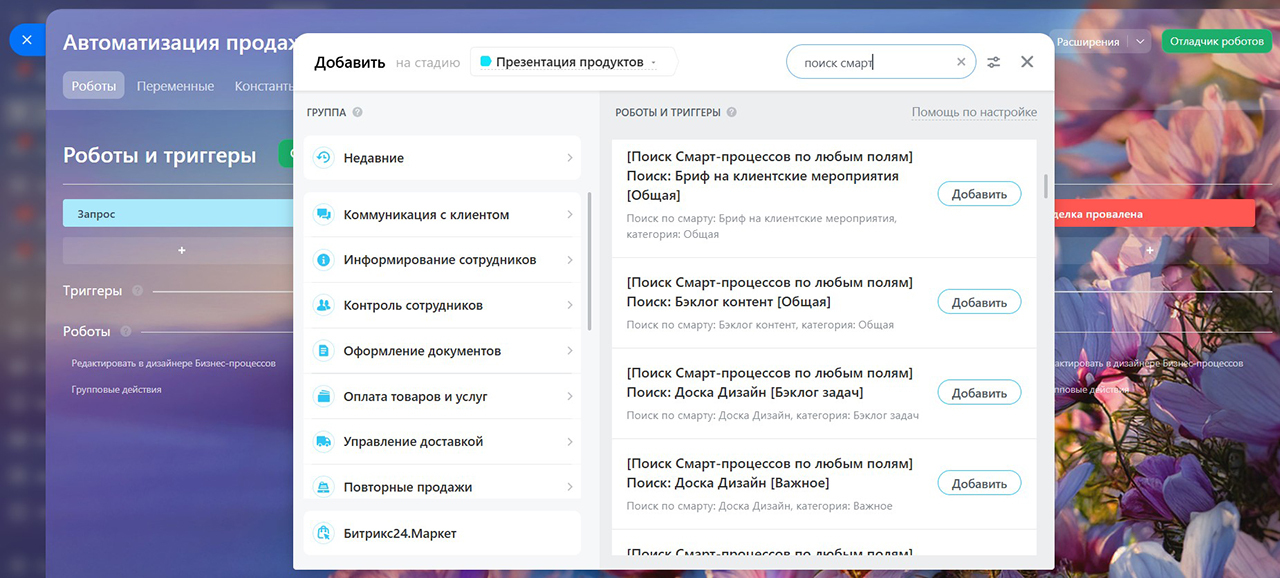 Теперь посмотрим, как это работает. На демостенде возьмем тестовую сделку. Нам нужны два робота. Первый — поиск. Возьмем поиск коммуникаций. Коммуникация — это пример другого кейса. Представьте: менеджер пообщался с клиентом и обычно пишет комментарий в правой колонке. Там запись и “умирает”: уходит вниз, её не выгрузить, не вывести в отчет. Поэтому создают смартпроцесс: дата, контакт, формат общения, детали. Менеджер заполняет карточку, и дальше по этим карточкам можно строить аналитику.