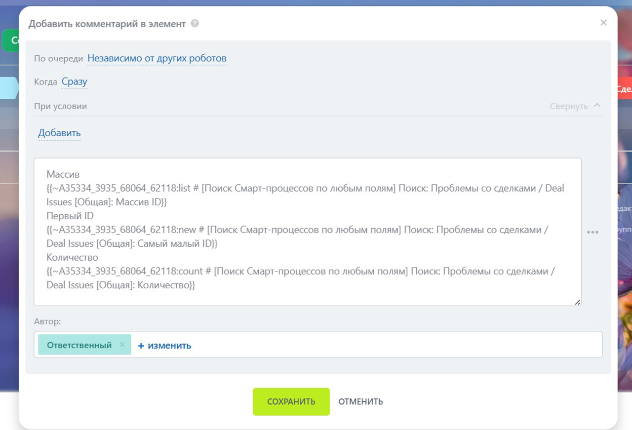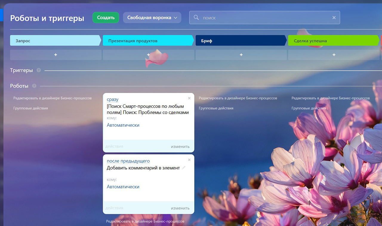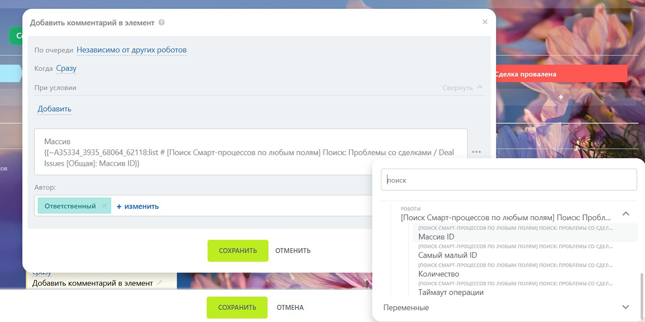Сохраняем. Первый робот ищет, второй показывает. Переходим на нужную стадию, возвращаемся — и роботы отрабатывают. Вот комментарий. Пример не дурацкий — данные есть.