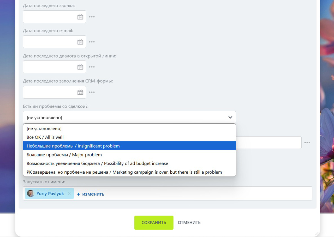 И вот я хочу найти все коммуникации, где в поле “категория” стоит “входит в топ-100”. То есть у компании выбран признак, что она входит в список ста самых интересных для бизнеса. Менеджеры иногда общаются с обычными компаниями, иногда с компаниями из топ-100 — и выбирают это в выпадающем списке. Сохраняем настройки поиска.