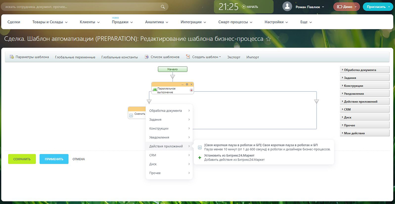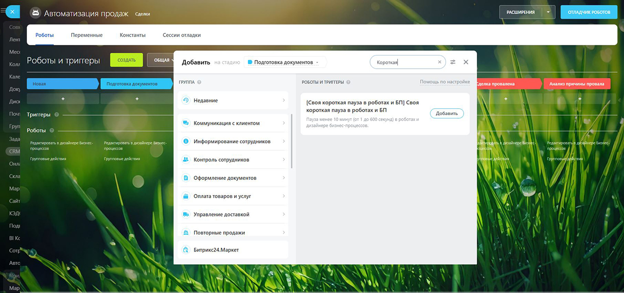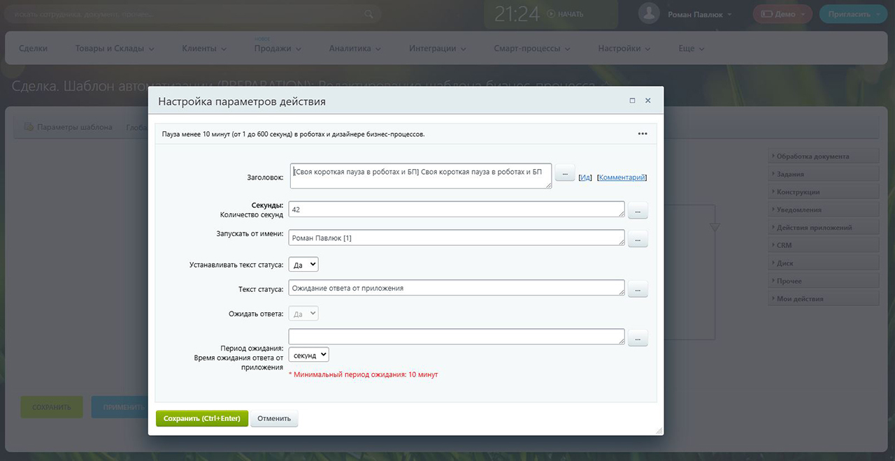 В чем история. В Битриксе есть штатный функционал, который позволяет отложить выполнение следующего действия на 10 минут или больше. Но часто 10 минут — это очень много. Особенно если вам нужно последовательно выполнить несколько действий, и на каждое требуется задержка. В итоге четыре паузы — это уже 40 минут, что совершенно неудобно и точно не то, что требуется в большинстве случаев. Нам может быть нужна задержка в 5 минут, в минуту, в 5 секунд. Именно под такую задачу и создано наше приложение.