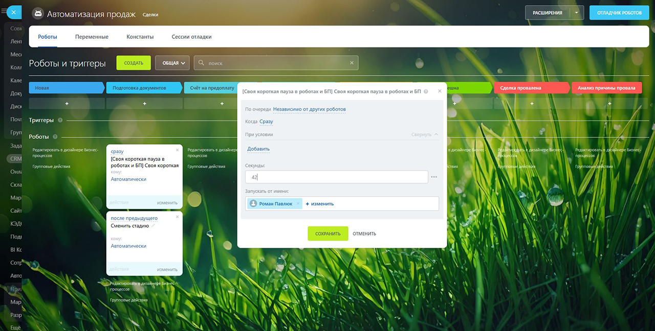 Почему я показываю это в открытой сделке? Возможно, вы тоже наблюдали у себя такую особенность. Если просто перетащить карточку мышкой, визуально она останется на месте, хоть процесс уже отработал. Вот я перетаскиваю сделку во «Встречу» — робот включился, 5 секунд прошли, но карточка с экрана никуда не улетает. На самом деле она давно в «Бриф», просто интерфейс не успевает обновиться. Чтобы это увидеть, страницу нужно перегрузить. Я её обновляю, и сделка появляется в колонке «Бриф».