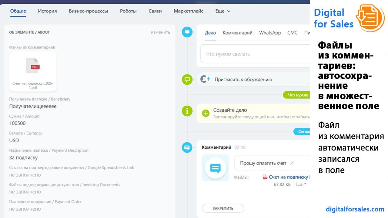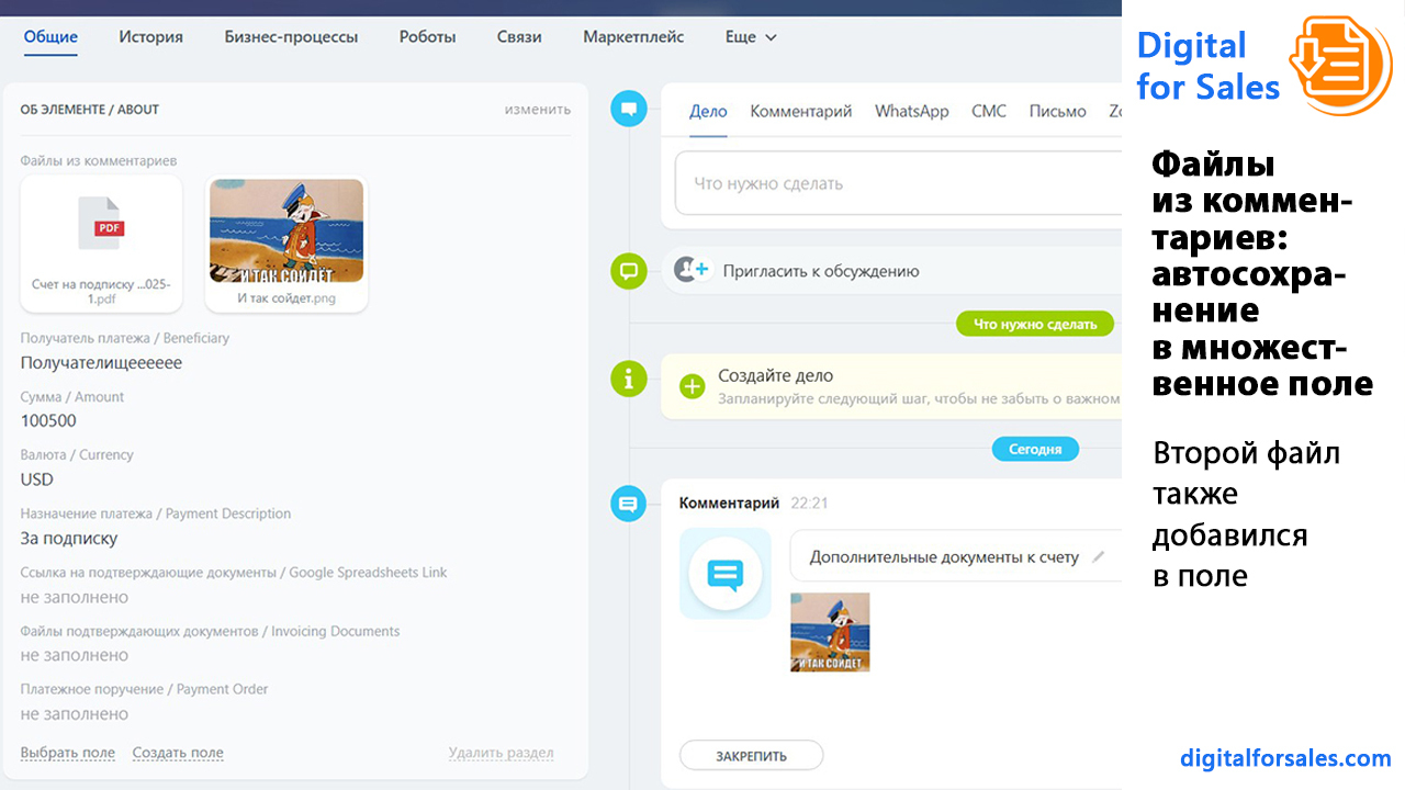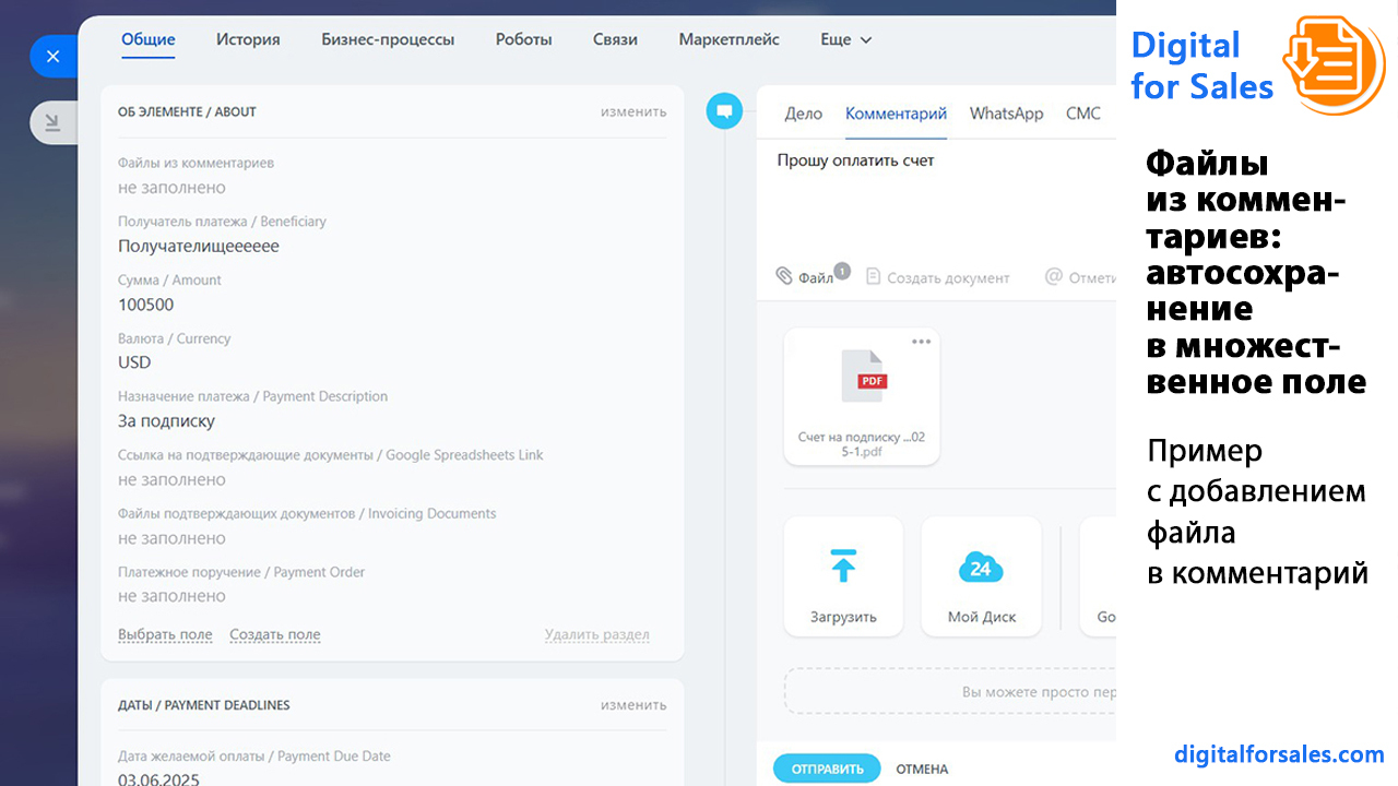 - Как автоматически сохранять файлы из комментариев в Битрикс24 в поле карточки?