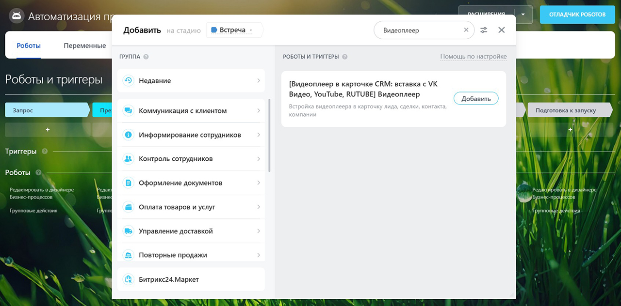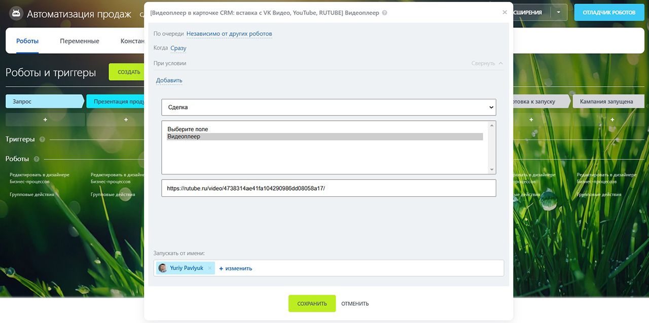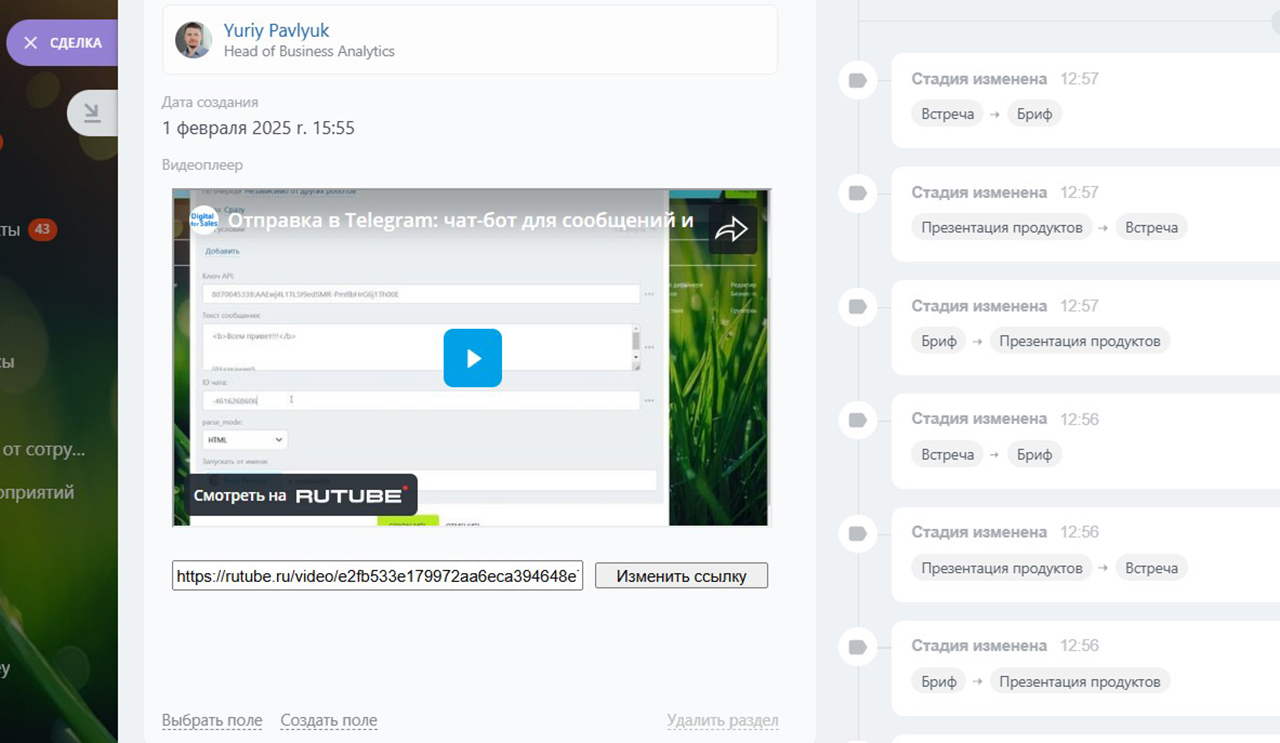 Теперь тестируем. Перевожу сделку в колонку «бриф». Играю роль молодого сотрудника, который не помнит, что делать на этапе брифования. И что происходит? Видеоплеер заполняется автоматически тем самым роликом. Я сразу вижу инструкцию прямо в сделке, без переходов, без поиска. Робот всё сделал за меня. Это максимально удобно.