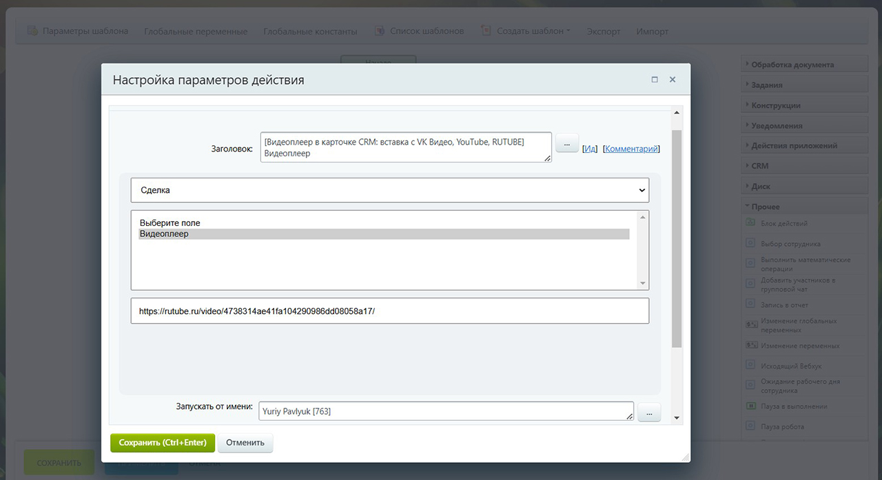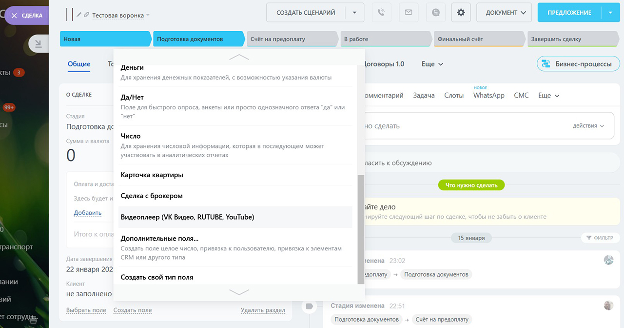 Что делает видеоплеер? Он позволяет вставлять и смотреть видео из ВК, Ютуба или Рутуба прямо внутри карточки. То есть без переходов, без вкладок, без поисков по базе знаний. Зачем это нужно? В первую очередь — для обучения. Представьте, что вы пришли в компанию восемь дней назад, ничего толком не знаете, а вам выдали пачку инструкций на сто пятьдесят страниц. Это полезно, но читать никто не хочет — нужно быстро влиться в работу. Гораздо удобнее, когда прямо в карточке сделки я вижу короткое видео: что делать на этапе один, что делать на этапе два, какие поля заполнять сразу, на что обратить внимание. То есть всё то, что обычно хранится в базе знаний, но теперь открывается в одно движение, не покидая сделку.