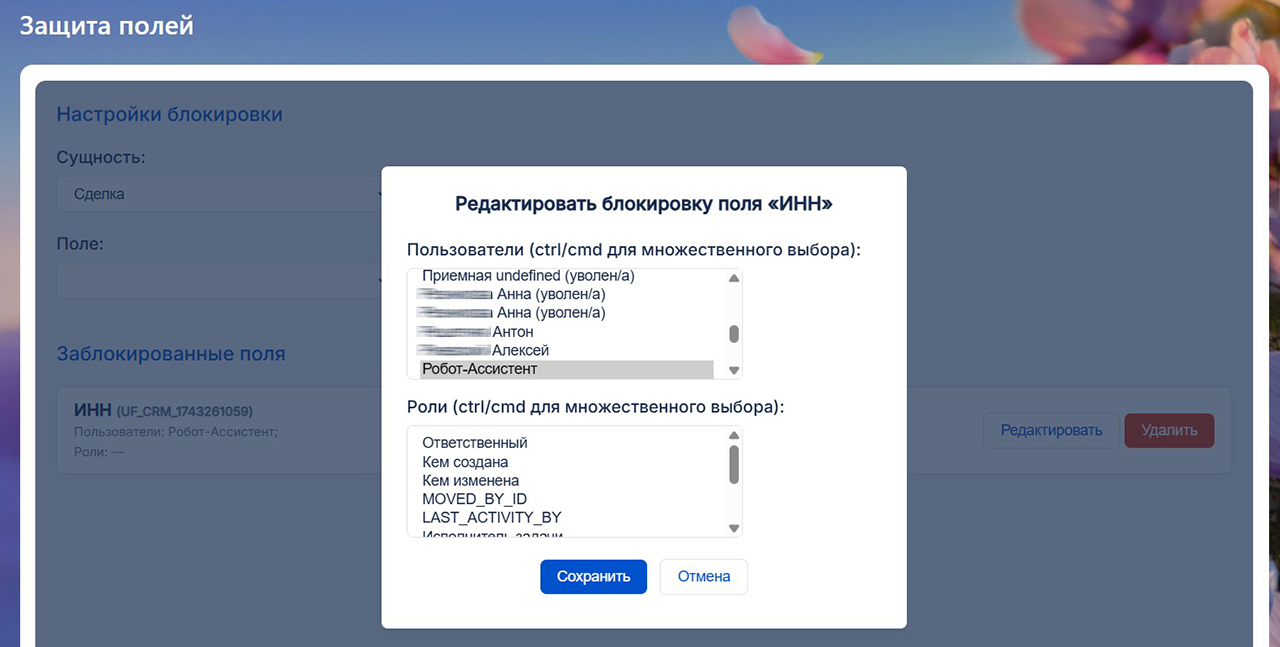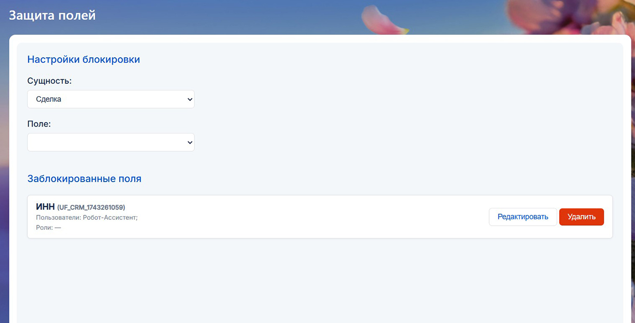 После завершения система показывает: какое поле защищено, кому разрешено его менять, какие роли заданы. В любой момент можно изменить настройки или вовсе удалить защиту.