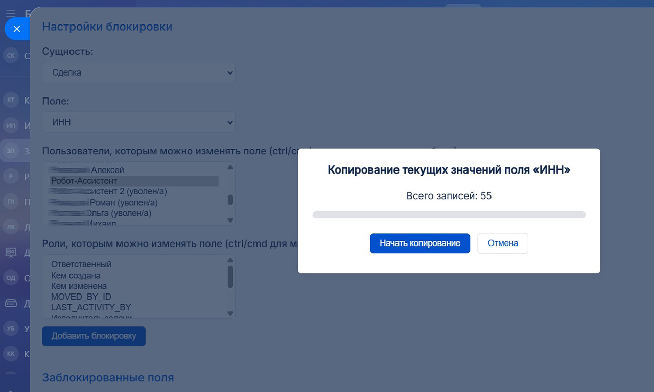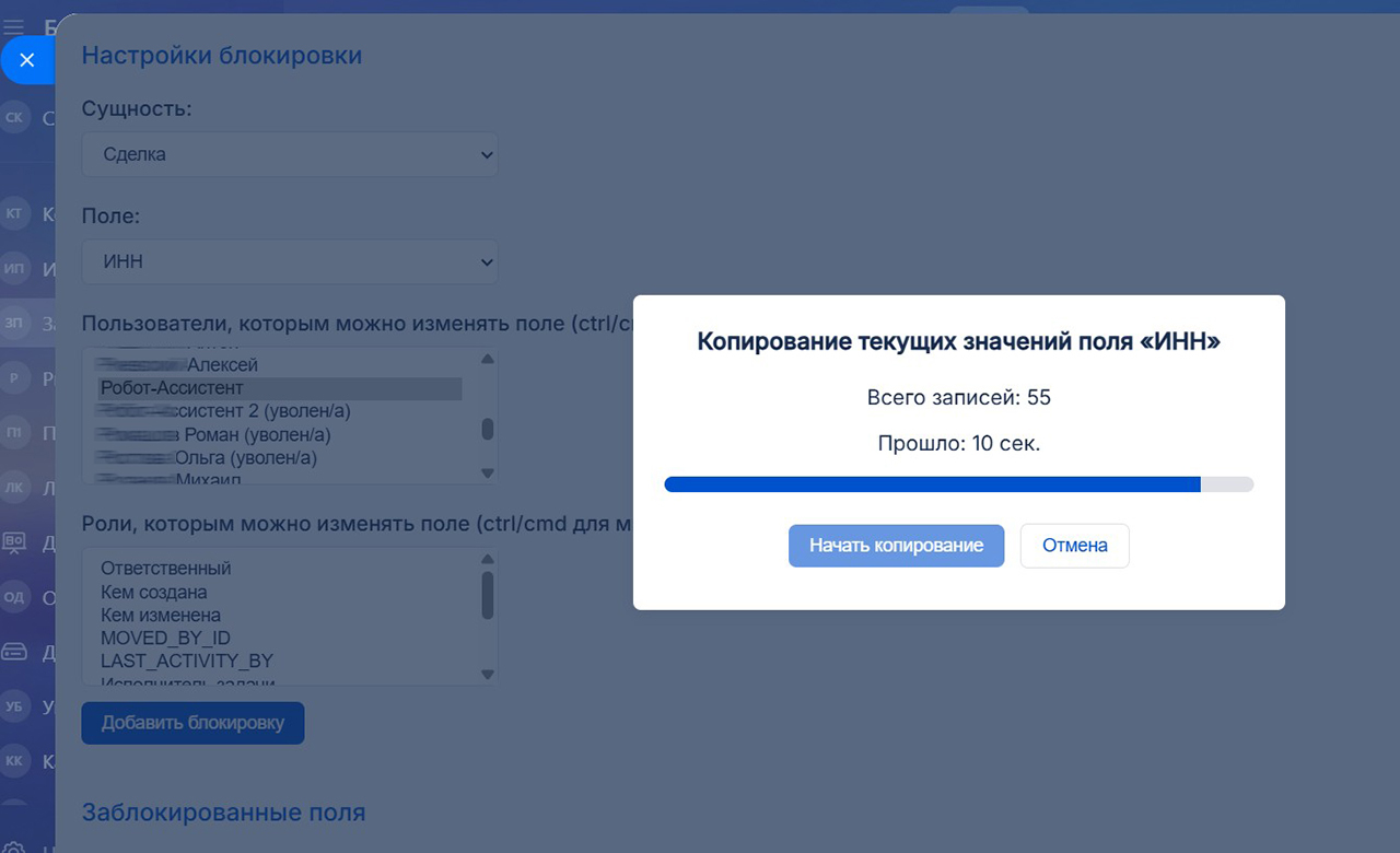 Выбираем нужных людей и/или роли — нажимаем «Добавить». Приложение смотрит все существующие карточки выбранной сущности, находит те, где поле заполнено, и запоминает его текущее значение. Это важный момент. Если записей много — тысячи сделок — на копирование уйдёт минута-другая. Это нормально. Есть прогресс-бар, индикатор времени — просто дождитесь окончания.