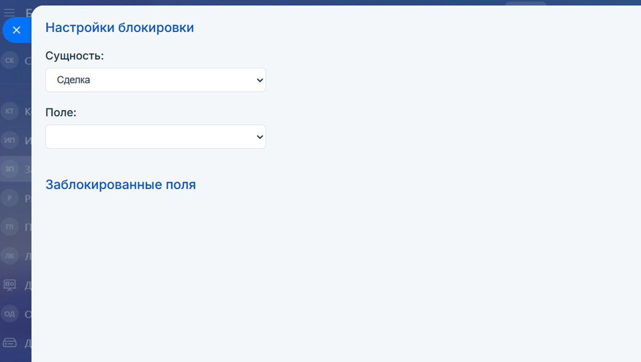 Переходим в Bitrix24. Приложение имеет пользовательский интерфейс — после установки в левом меню появляется пункт для настройки блокировки. Выбираем сущность: лиды, сделки, контакты, компании. Пока что смарты не поддерживаются, но в следующих релизах это появится.