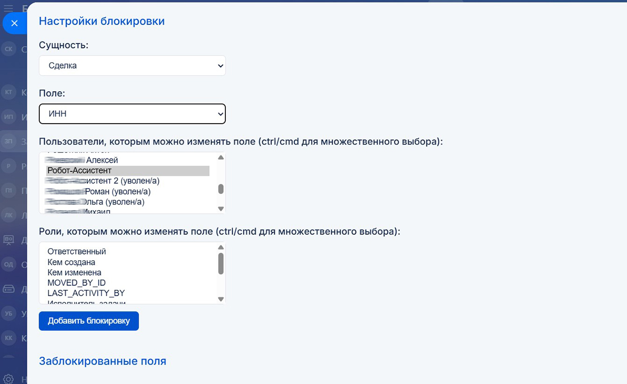 После выбора сущности подгружается список всех полей. Я продолжу пример с полем ИНН. Нашёл в списке это поле. Теперь нужно указать, кому разрешено его редактировать. Можно выбрать конкретных людей — работает множественный выбор через Ctrl или Cmd. А можно выбрать роли: создатель карточки, последний изменивший, ответственный. Причём роли и люди прекрасно комбинируются: можно выбрать несколько человек и, например, ещё и ответственного. Ролевой подход особенно удобен, когда воронки меняются, этапы переходят, и ответственный меняется автоматически.